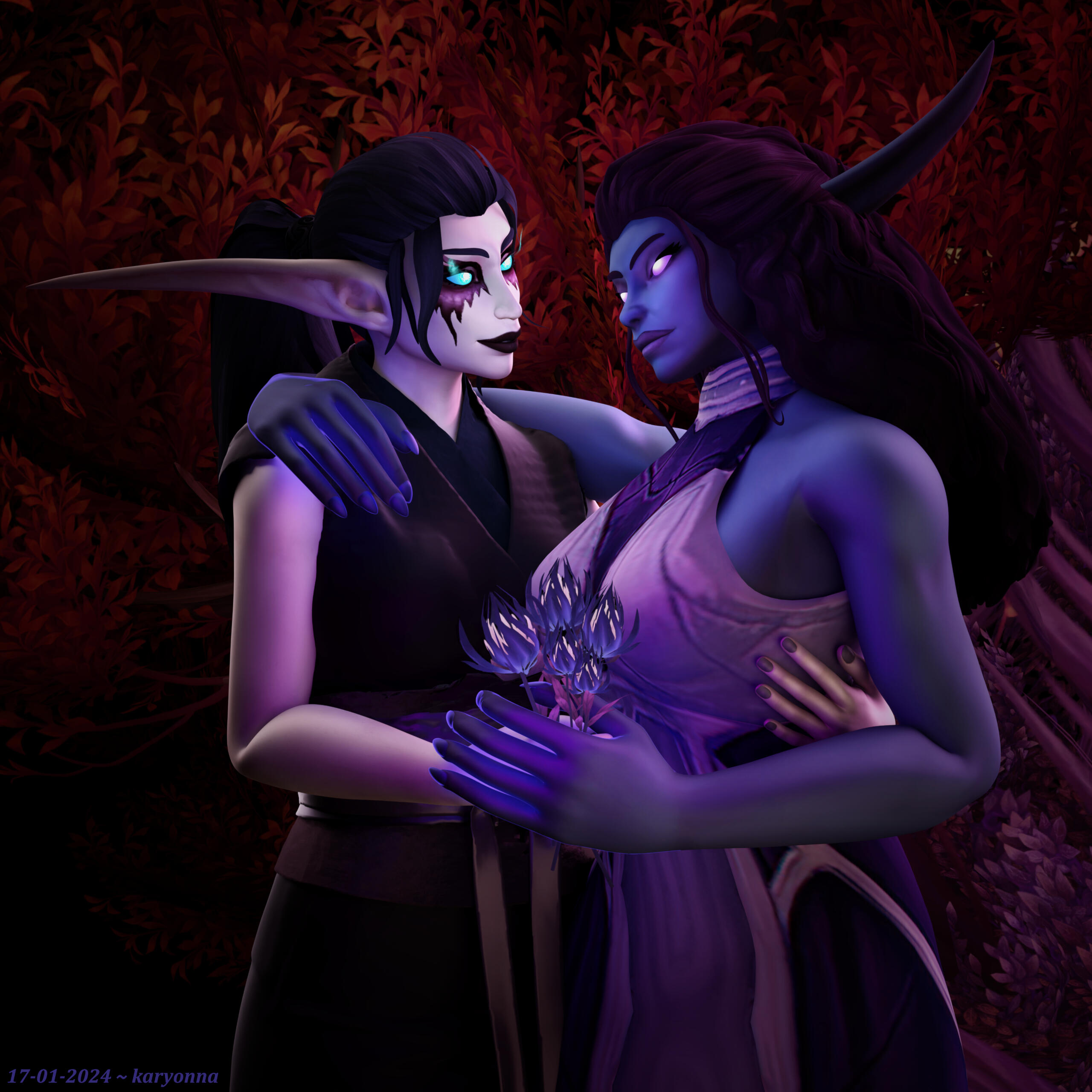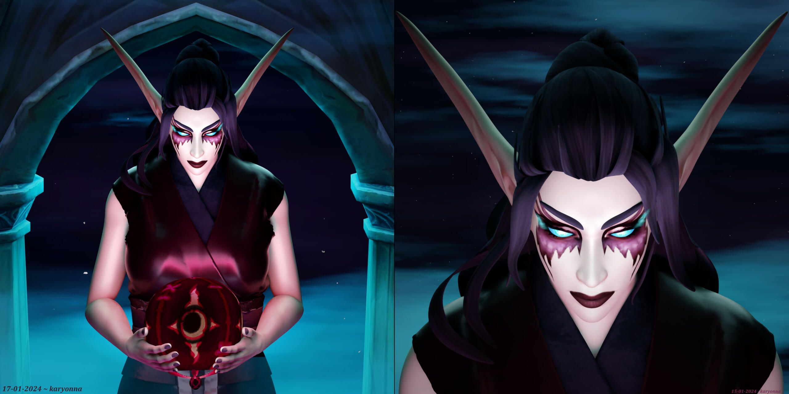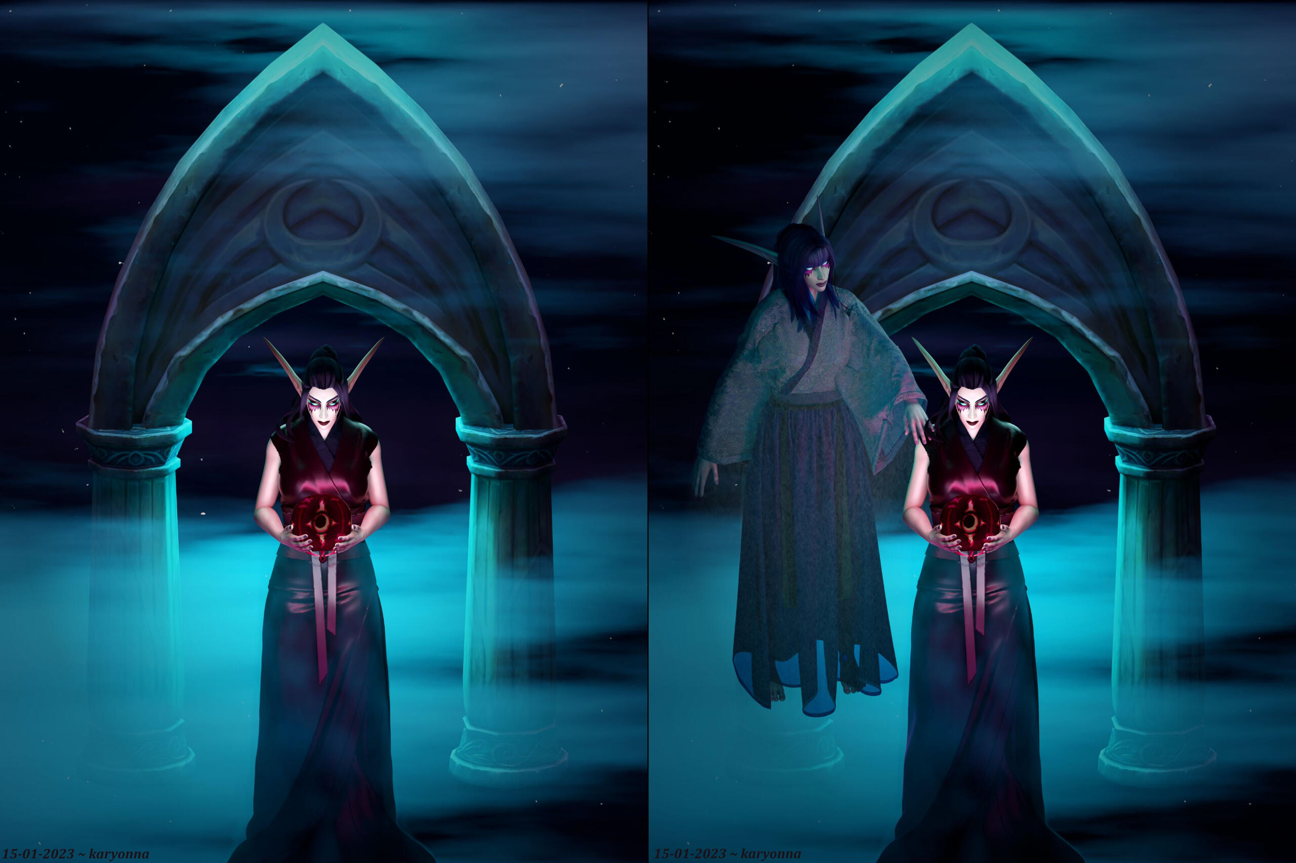 My OC Aryennya in a simple background pin-up pose and in a customized background with Darion Mograine respectively.