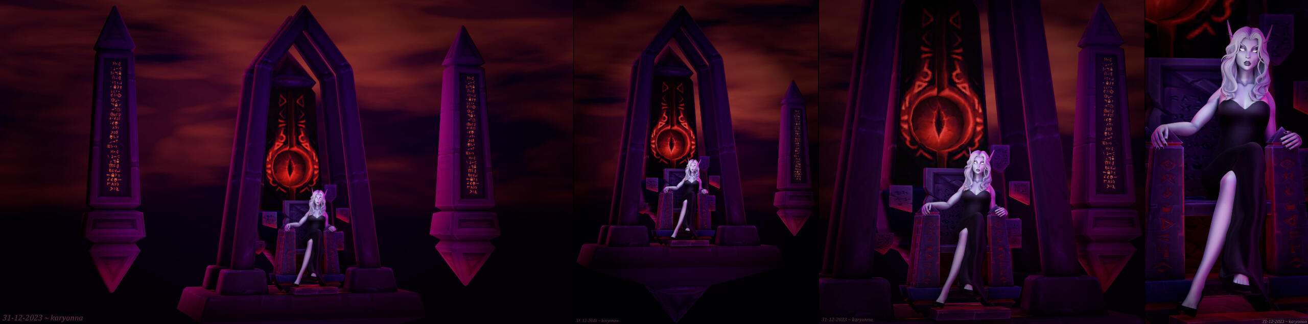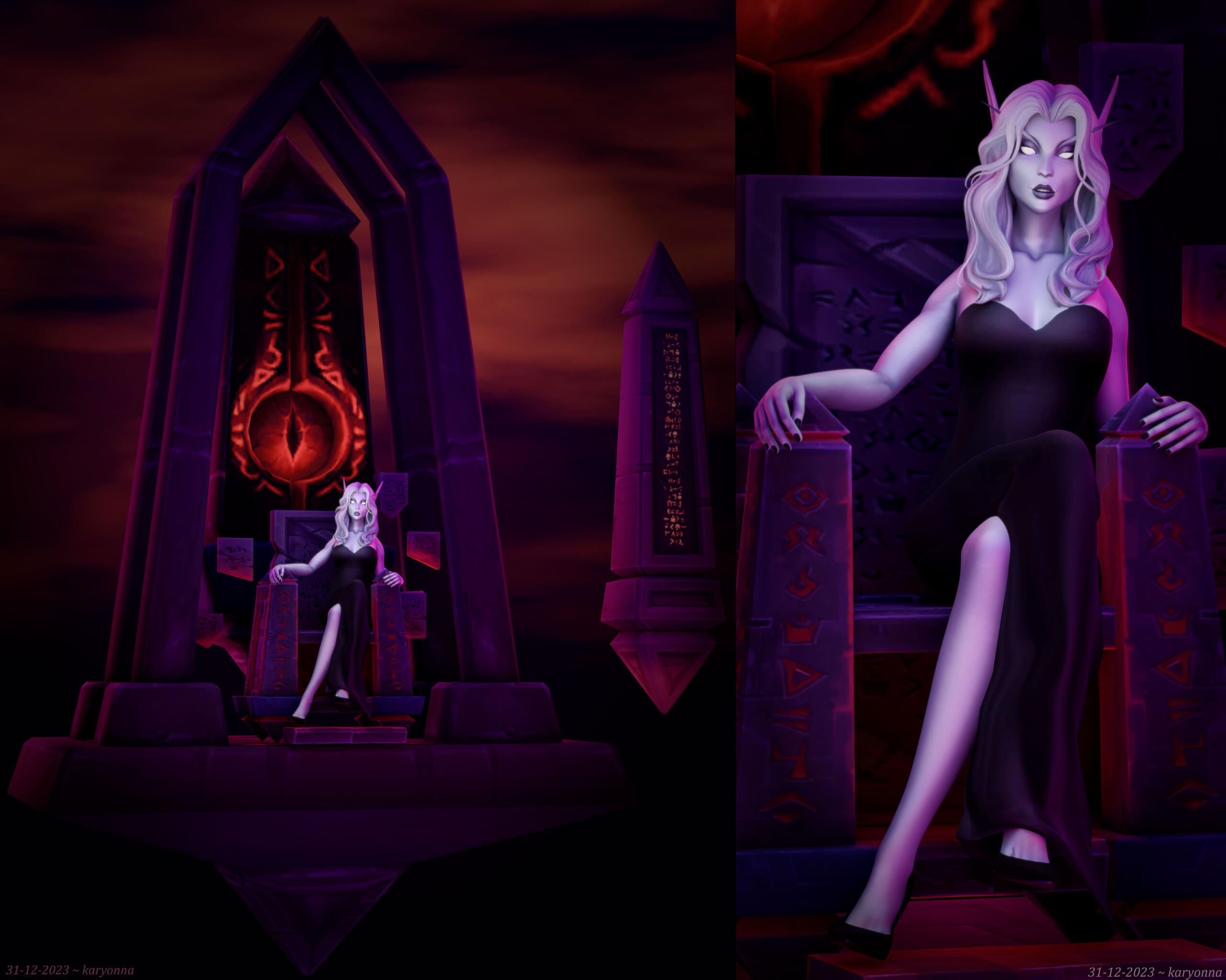 The custom environment consists of assets from BFA patch 8.3 (N'Zoth invasions). The throne is made out of separate pieces from these assets, such as small obelisks to cap the armrests and tablets that I rearranged into the seat, armrests, backrest and steps leading down.