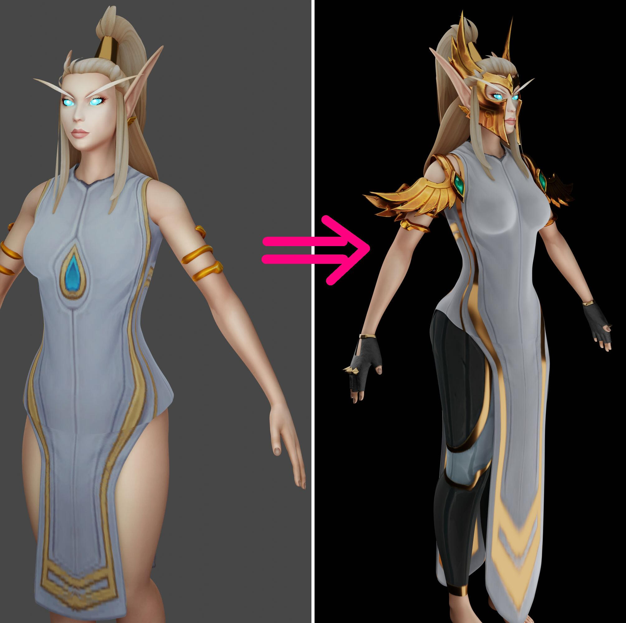 DEPENDING ON REQUEST4. Visual changesIf there are any changes to the base game colours, have visual references. It could be art, it could be a screenshot altered in Paint to show the new colours and their place - swatches are great.The same applies to visual gear changes. Examples: you want a piece to not have feathers, the weapon should be a different size, a cape should be longer or wider etc. Again, drawing a few lines over a screenshot in Paint will help.Any further visual references (such as extra character art) help with adjustments to better match the look of the character to your concept, if applicable (such as longer hair, face/body shape).The more complex the changes are, the more important it is to have more varied visual references!5. Background / custom environment.