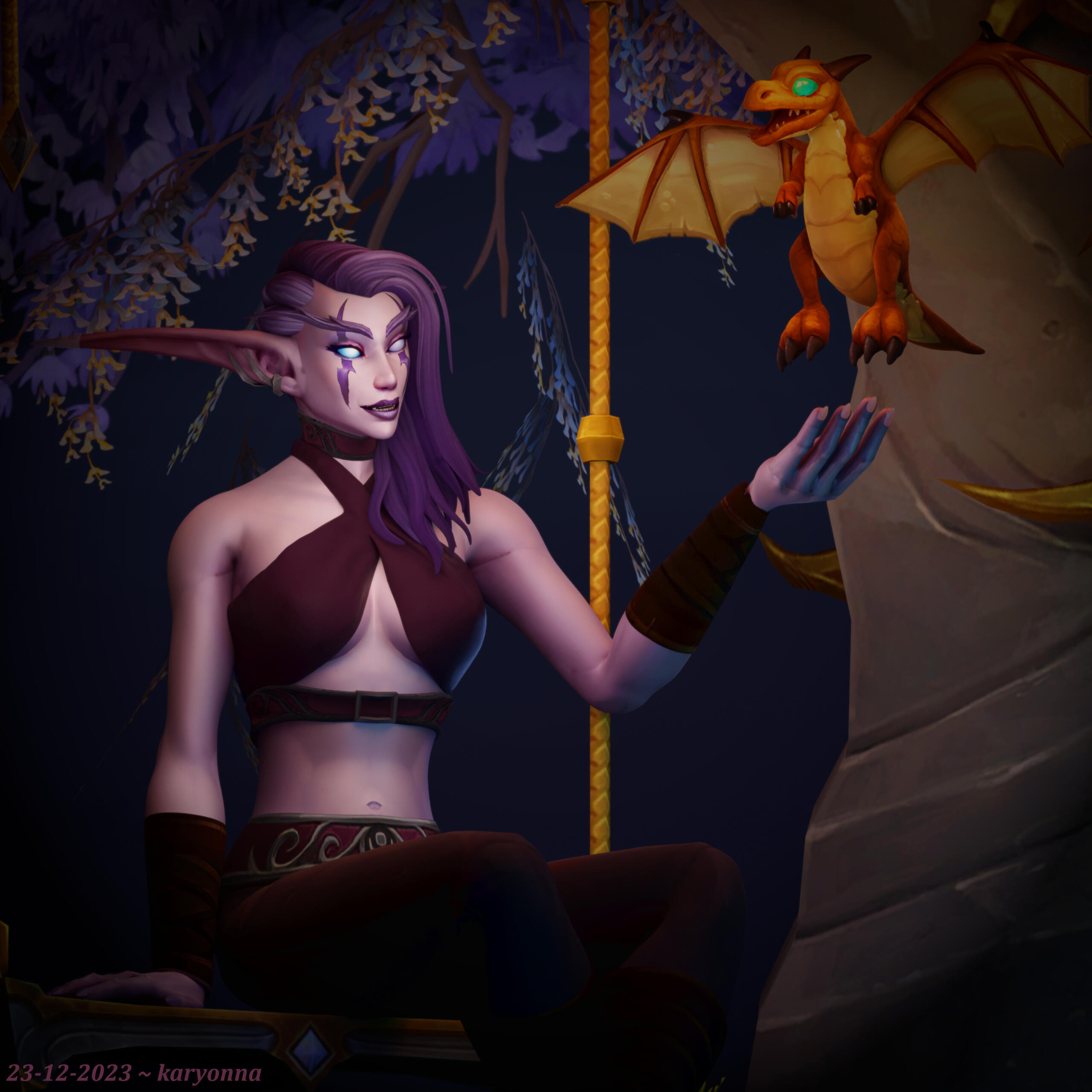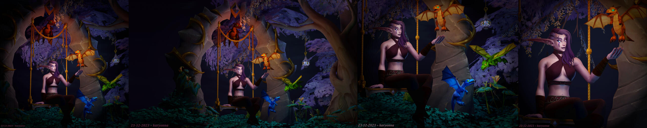 The detailed environment is the "reading corner" next to the Lettle Scales Daycare in Valdrakken. You can find this in-game but there were a few changes made for the purpose of this render: the arch and swing are smaller, the tree is brought closer to be part of the image, and there is more foliage on the ground.