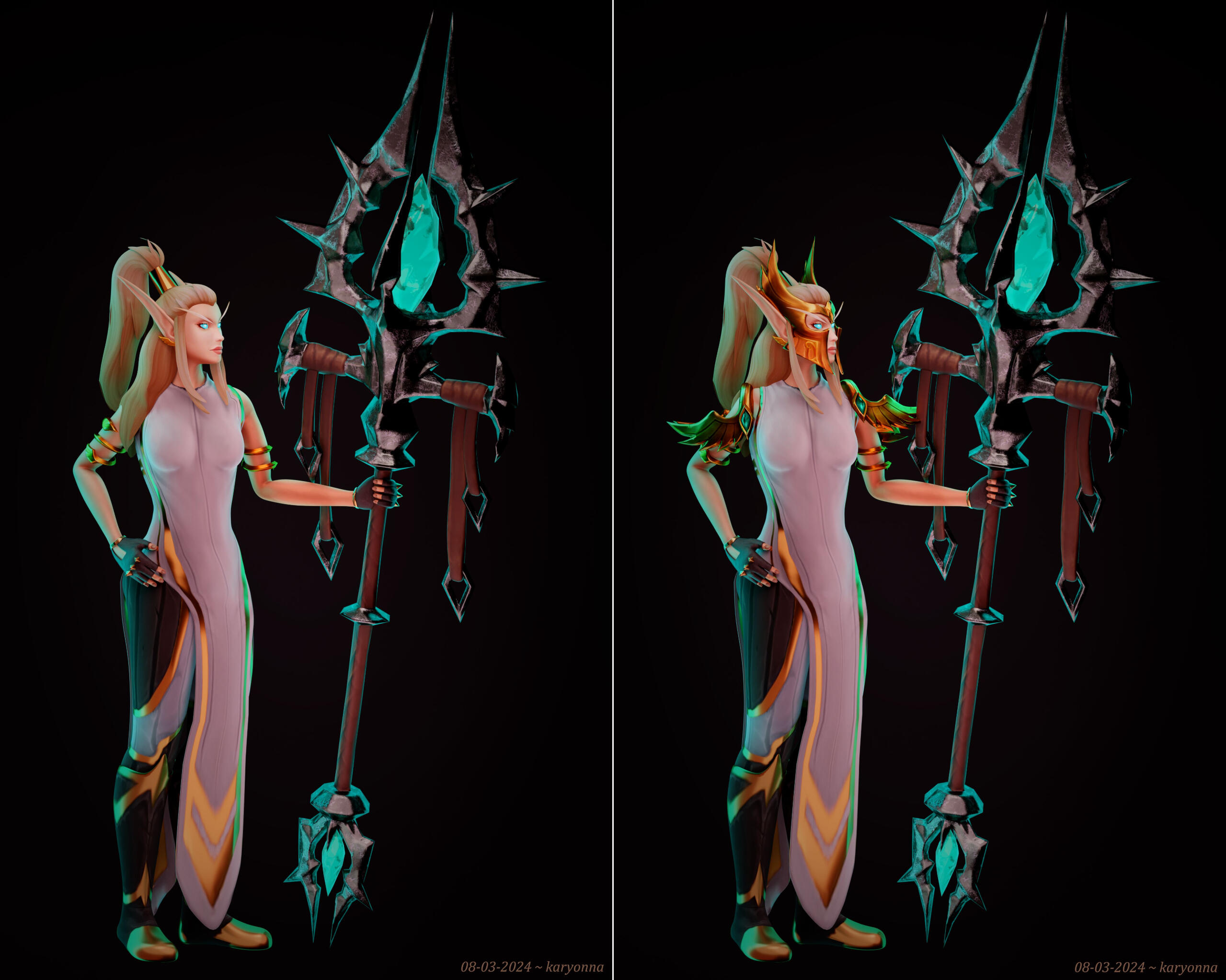 Base includes 1 main weapon + 1 offhand. Any extra items beyond that will be $5 each.Recolors and texture upgrades to model or gear are included in the base price.Final shot can be portrait, HB, FB depending on the request and preference - this doesn't influence the price, the background and any extra angles do.