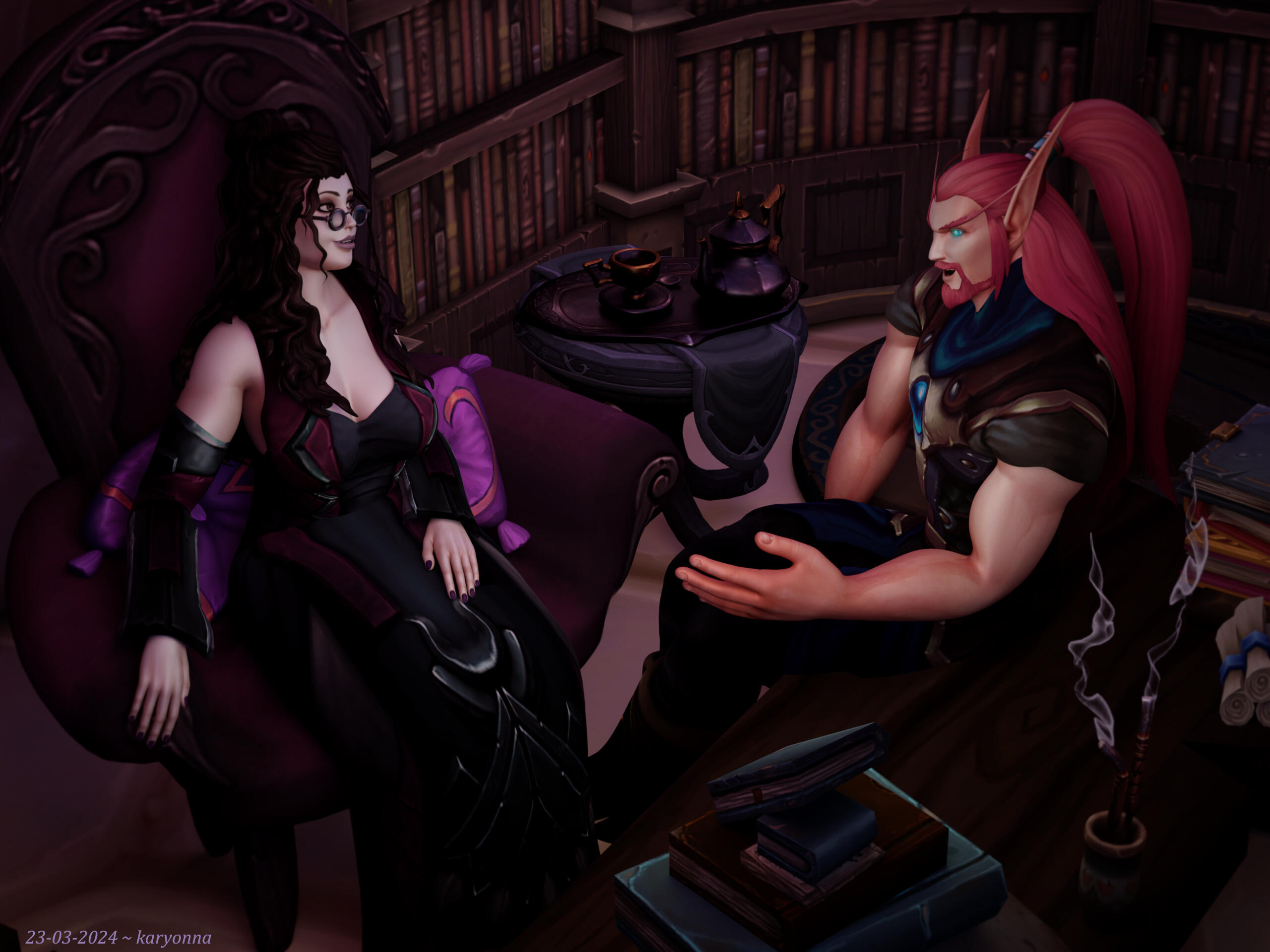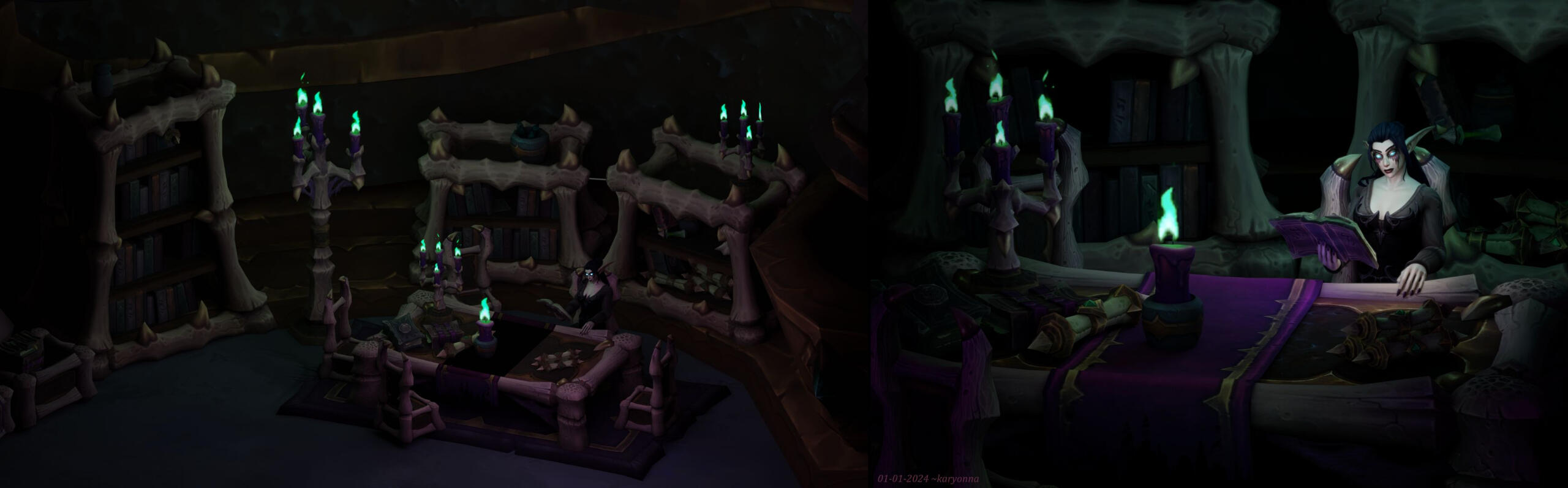 The first custom environment I made in 2023 was rearranging the contents of a Maldraxxus tower to create a study for my OC. I revisited this environment in January 2024 to improve the lighting and assets slightly, but I have not yet updated the character model in the scene so there will probably be a new version in January 2025 to establish a tradition of sorts!