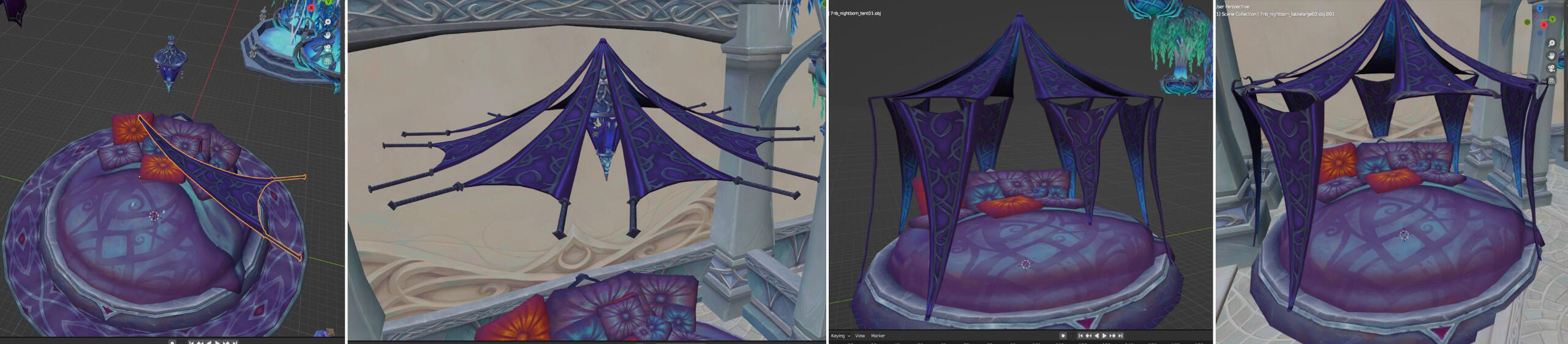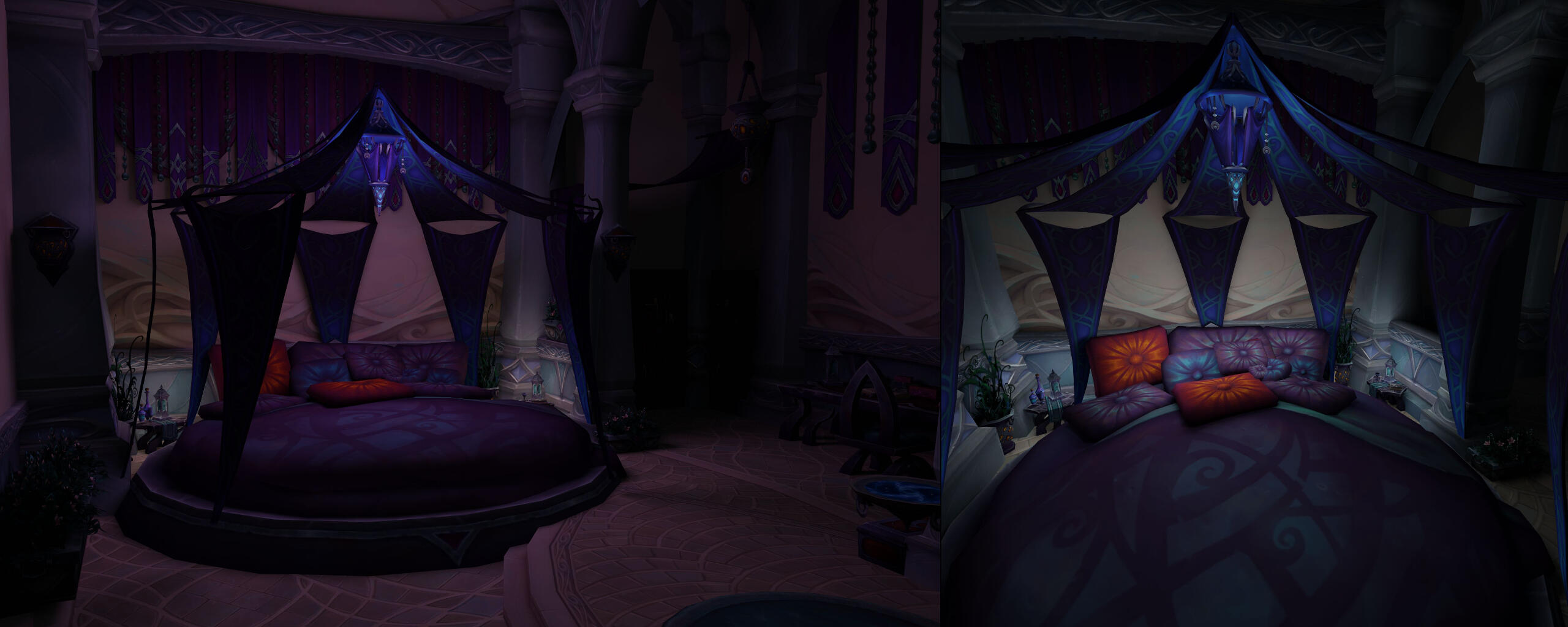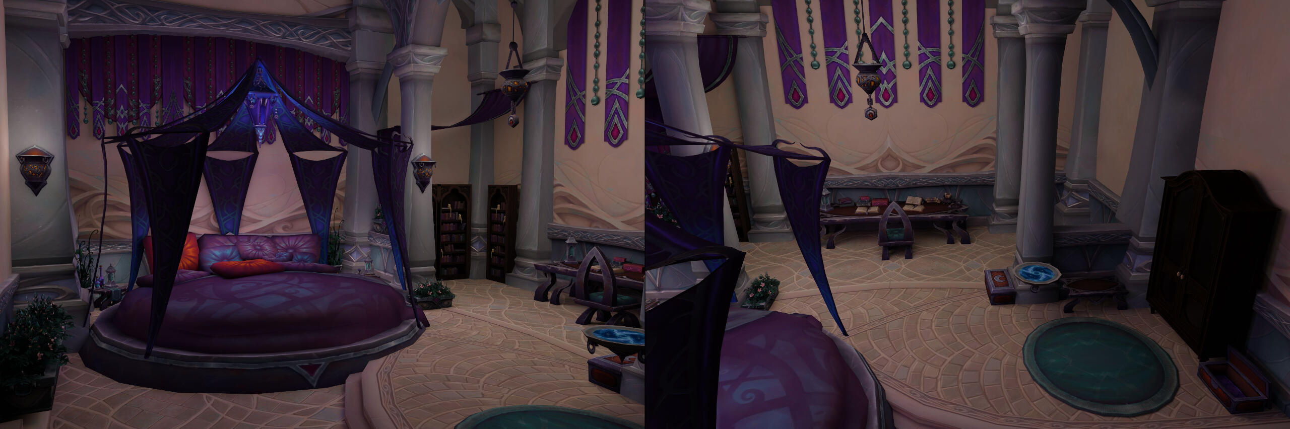 As I started writing the story of my OC Aryennya and described some of her belongings and living space in writing, I felt I wanted a better representation of her bedroom. This is how her custom room came to be.It is built in a so-called "Suramar single" (what is seen in-game as a house with a single room, no upstairs) although it is meant to be the upstairs of her apartment. The reason is that the in-game upper levels featured in Suramar houses are a little cramped against the ceiling and don't cover the entire floor area.The bed is the most customized piece because I wanted a sort of canopy and nothing I found in the finished assets satisfied me. So I took a tent piece that I mirrored and duplicated in a circular shape to create the magical strips of fabric above the bed, then mirrored again and elongated for the fabric that is hanging.