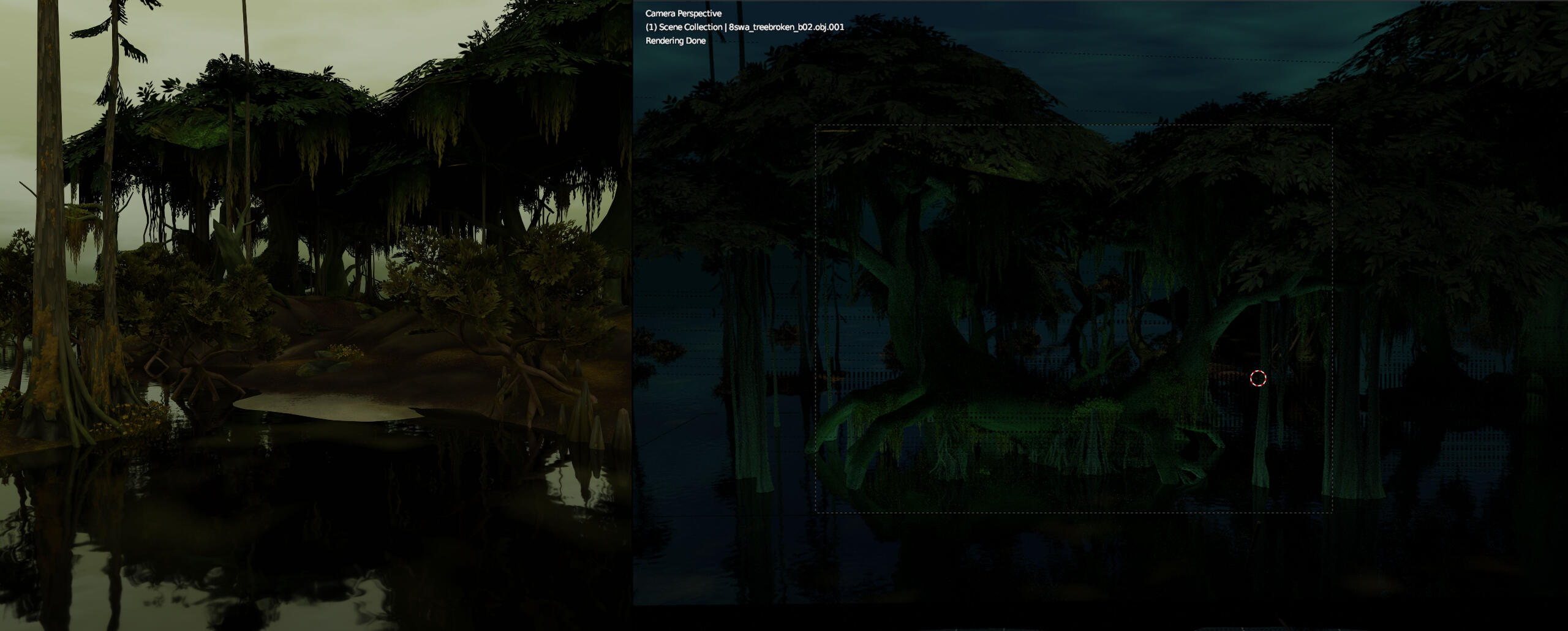 The swamp environment I pulled from a Zandalar map has served me for 2 separate scenes. First, the more lit-up, front part of the swamp environment, is the place where the death knights led by Darion Mograine find my OC Aryennya unconscious in the water. Second, the opposite side of the same map slice was used with a dark night sky to create the environment for Nekrokat's birthday art for her OC Ecatee.