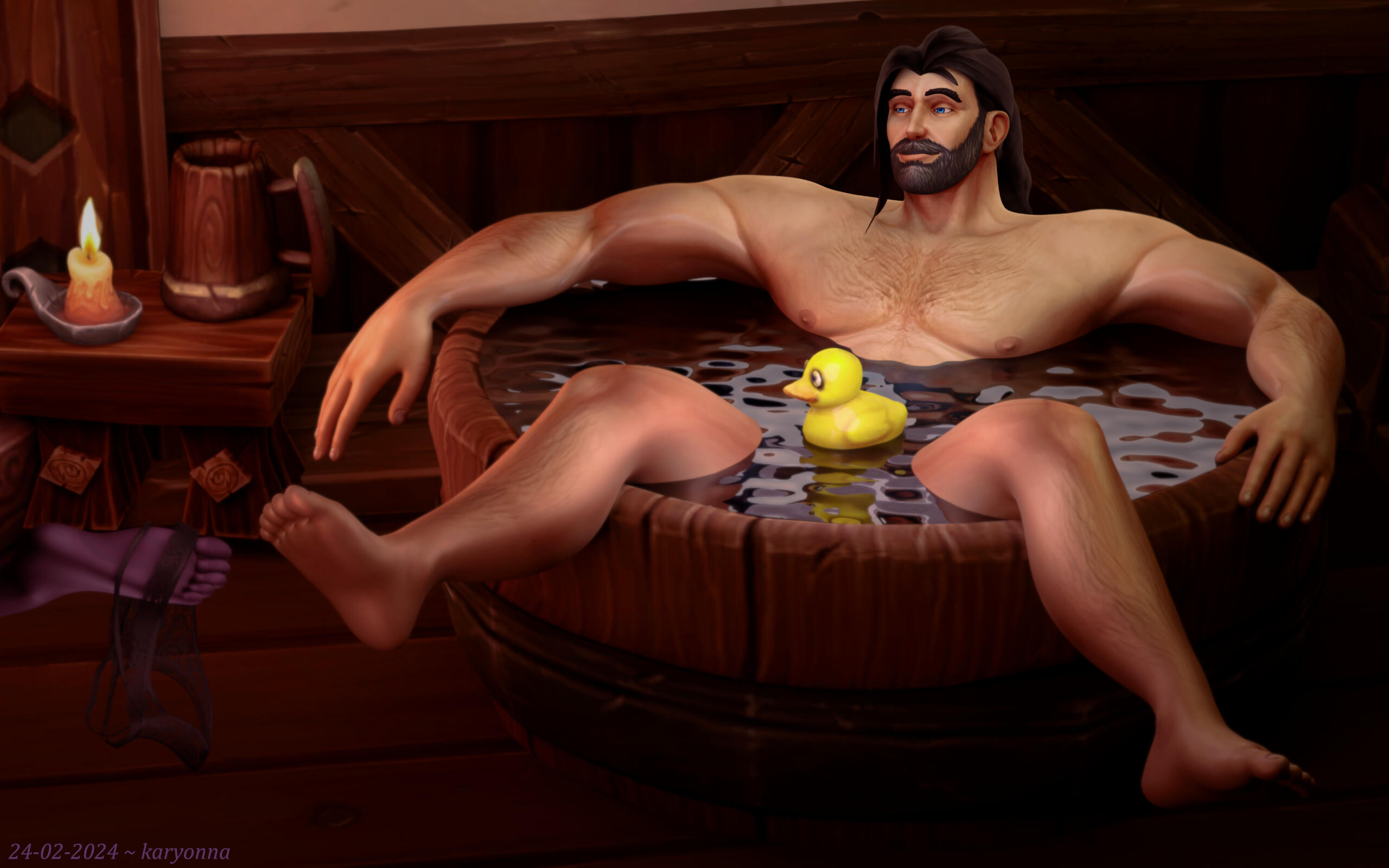 Simple character with detailed environment.Main render for a friend's OC, with just the hint of something more in the background. I tried to keep this one a bit fun, modelling it after the Witcher bath tub scene and including the rubber ducky.The background is bordering on customized environment because there were a few more renders in this series and I added some assets and adjusted the existing ones to a degree.